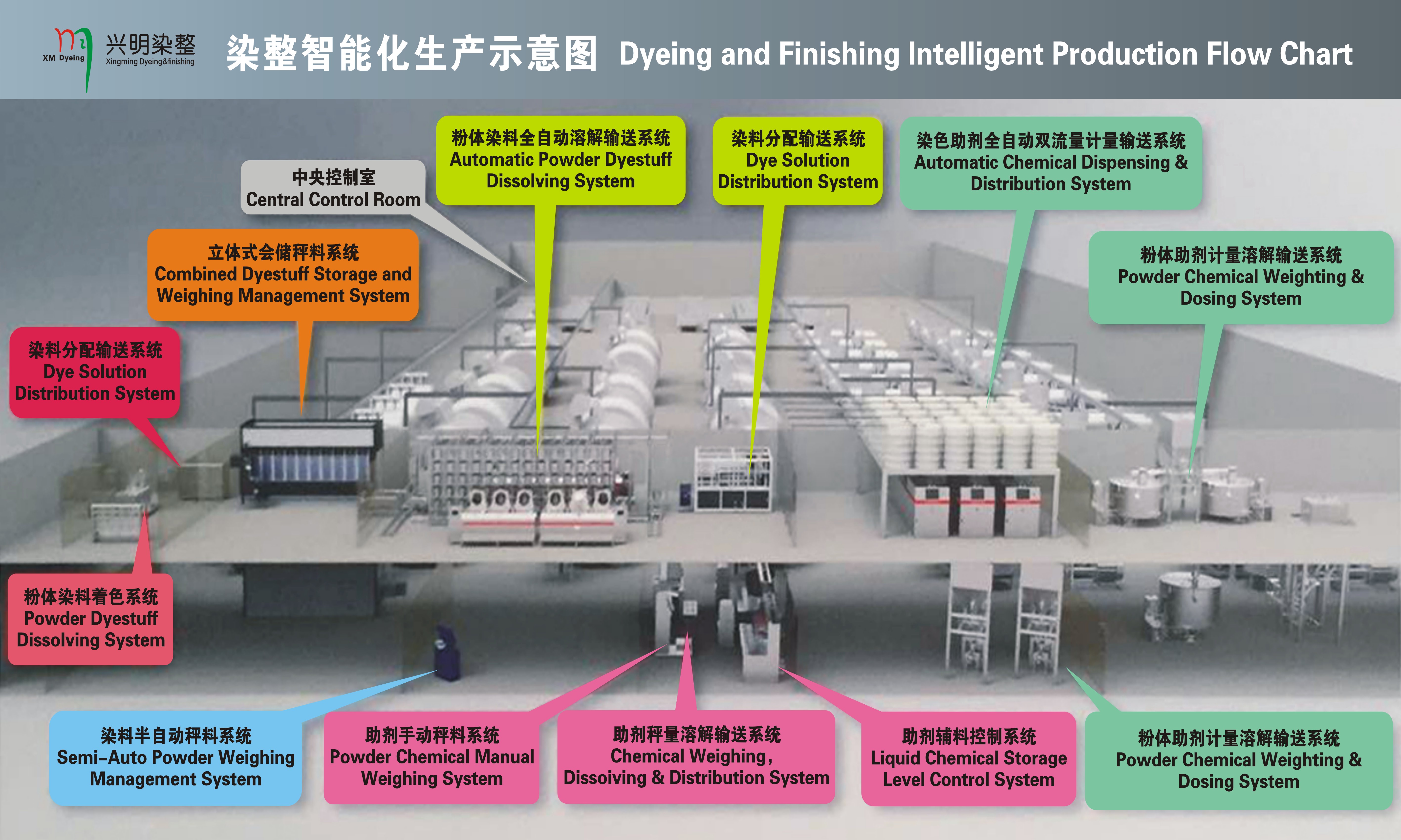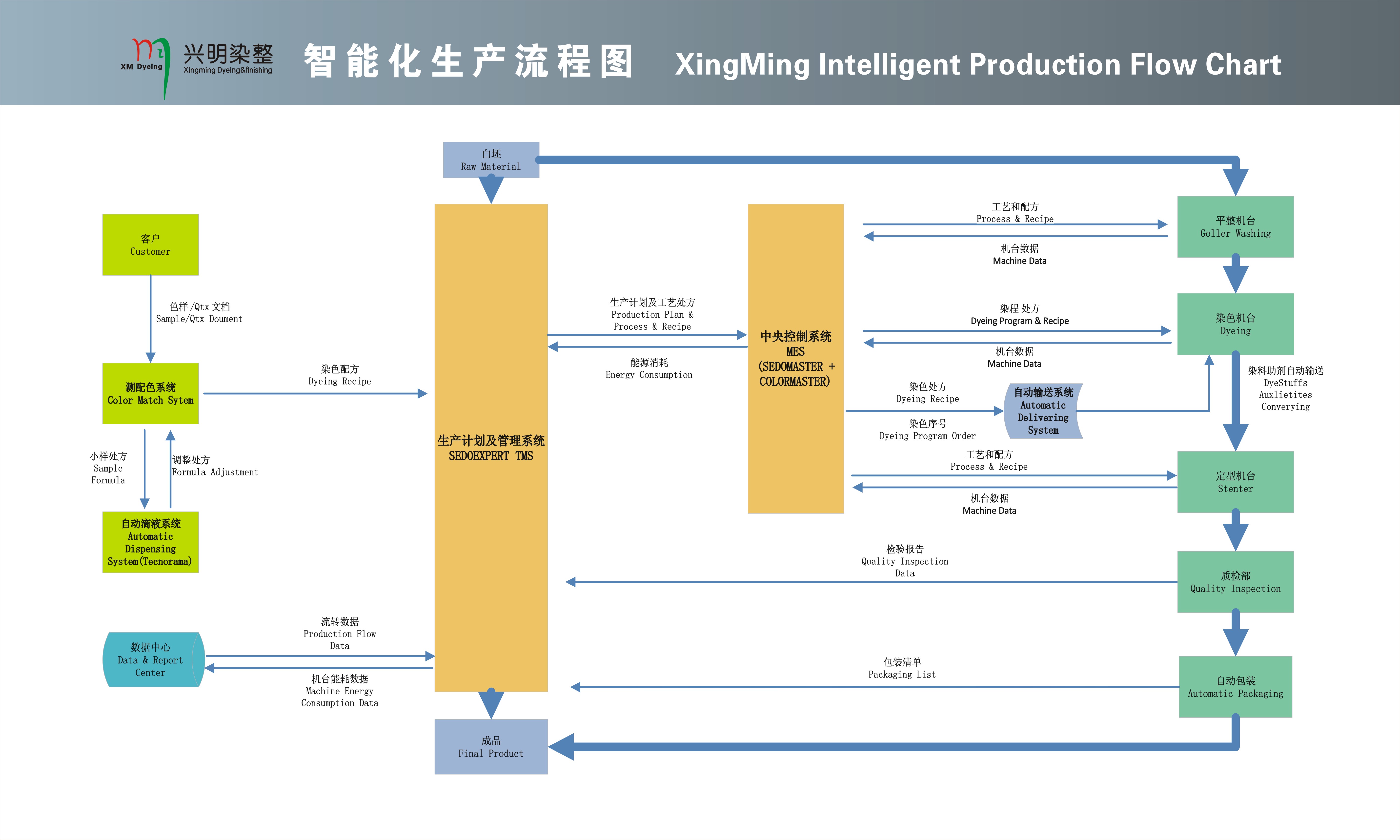 興明染整基于對(duì)今后染整行業(yè)的新觀點(diǎn)、新認(rèn)知,經(jīng)過(guò)長(zhǎng)時(shí)間行業(yè)及市場(chǎng)驗(yàn)證,花重資從國(guó)外引進(jìn)了一系列先進(jìn)的自動(dòng)化設(shè)備和一套與設(shè)備互聯(lián)的全流程數(shù)字化染整管控系統(tǒng)。